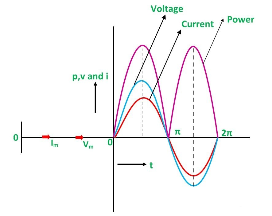 此外,如果我們檢查同一電路的圖形表示,從其功率曲線可以看出,任何時候功率周期的任何部分都不會變?yōu)樨?。因此,在純電阻電路中,功率永遠不會為零。此外,這是由于電流和電壓的瞬時值始終為負或正。同樣,純電阻電路的功率循環(huán)頻率是電流和電壓波頻率的兩倍。