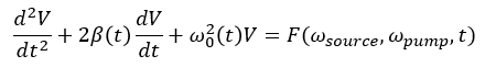 根據(jù)基爾霍夫電壓定律,由于輸入源,其RLC支路,R2C3形成閉環(huán),因此該環(huán)路形成了一個具有固有頻率和阻尼的周期性調制的阻尼振蕩器。這種類型的系統(tǒng)稱為參量振蕩器,通過阻尼Mathieu方程進行描述。
