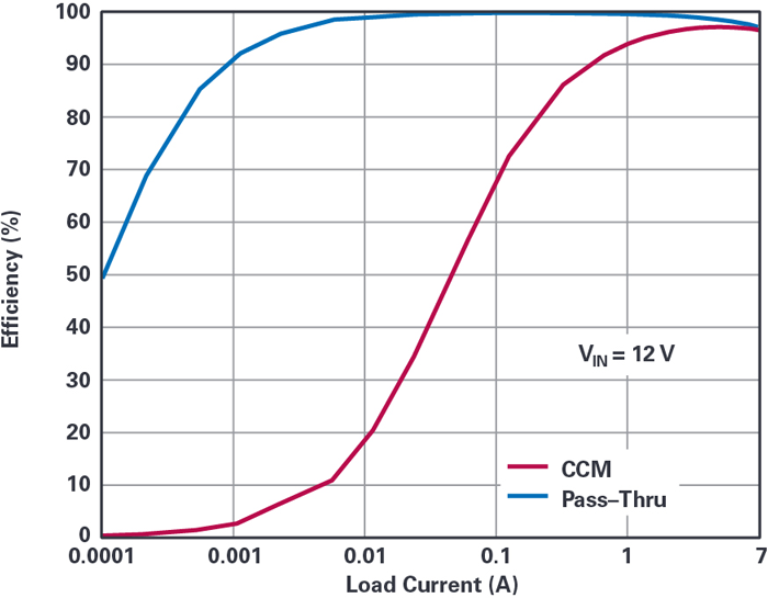 當(dāng)輸入電壓在Pass-Thru窗口內(nèi)時(shí),頂部開(kāi)關(guān)AD連續(xù)導(dǎo)通,從而允許輸出跟蹤輸入,并使器件進(jìn)入低功耗狀態(tài),并在V INV IN上施加典型的靜態(tài)電流。V INP引腳分別為4 μA18 μA。在這種非開(kāi)關(guān)狀態(tài)下,既沒(méi)有EMI也沒(méi)有開(kāi)關(guān)損耗,使效率可達(dá)到99.9%以上(圖5。