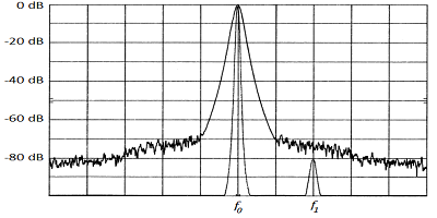 在頻域中,相位噪聲測量可能類似于下圖所示。在此,以f0的載波頻率發(fā)出信號(hào),而在f1處以較弱的頻率發(fā)出信號(hào)。f0上存在相位噪聲會(huì)有效地增加信號(hào)的帶寬并提高本底噪聲。如果f1處的信號(hào)足夠弱,則該信號(hào)將隱藏在f0的相位噪聲之后。