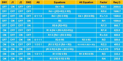 表1:不同開關(guān)設(shè)置和相應(yīng)方程式的電阻器組合